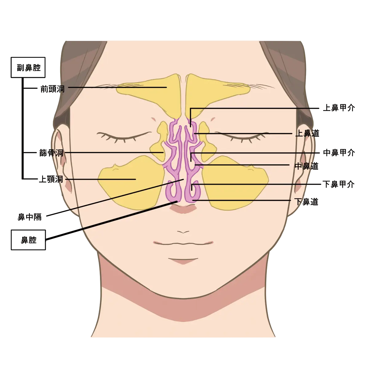 風邪・細菌感染により副鼻腔に膿がたまり、頬や額の痛み・鼻づまり・においの低下を起こす。
